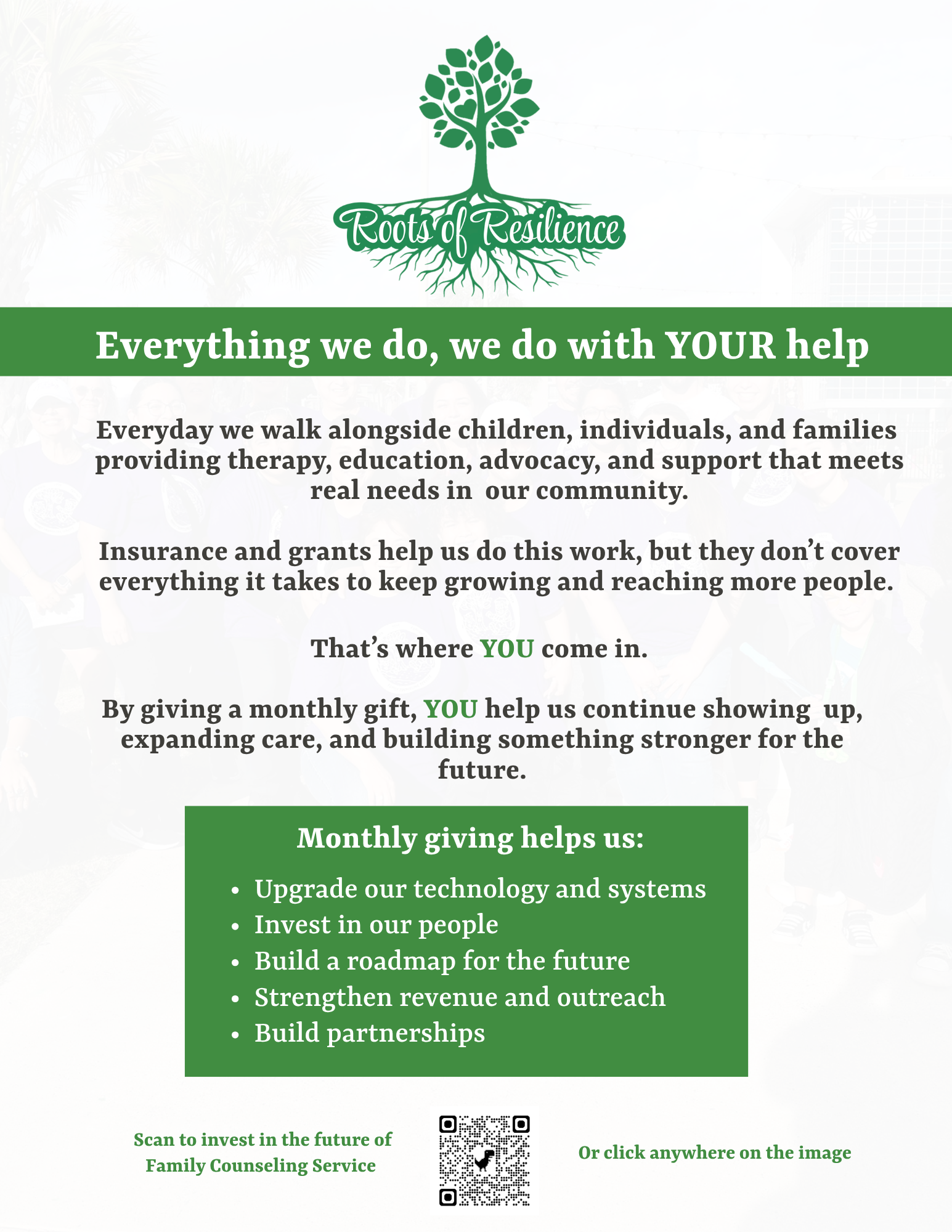 Our Roots of Resilience monthly giving program allows us to continue showing up—expanding care, investing in our team, strengthening outreach, and building partnerships that make long-term impact possible.