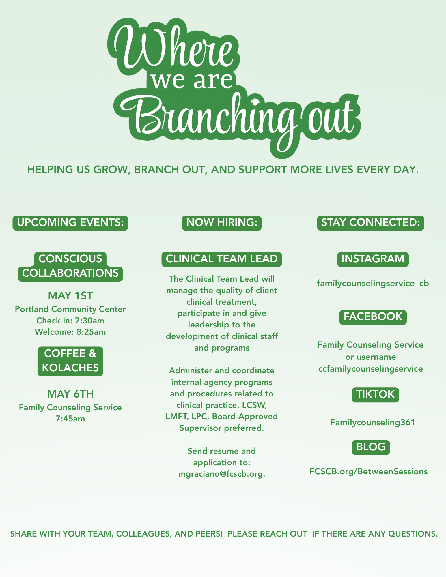 We’re excited about upcoming events like Conscious Collaborations and Coffee & Kolaches, as well as opportunities to grow our team, including our current opening for a Clinical Team Lead.